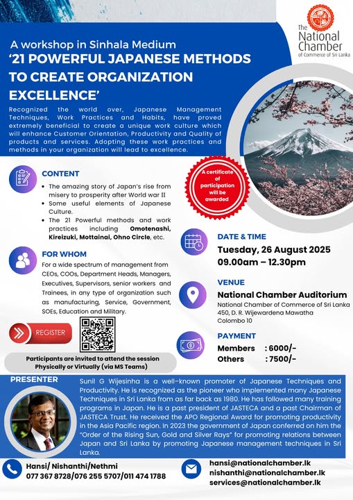 “21 Powerful Japanese methods to create organization excellence” – Half a Day workshop in Sinhala medium Registration Link: https://forms.gle/CT8rDLhJYZwMGDJu7